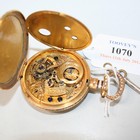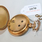 A gold cased seed pearl set and blue enamelled keywind open-faced gentleman's pocket watch, detailed to the engraved movement 'Just & Son London 2062', gilt metal inner case, the enamelled dial with black Arabic numerals, gilt hands and centre seconds, the bezel and suspension bow mounted with half pearls, the back with blue enamelled decoration within a border of seed pearls, with a key.