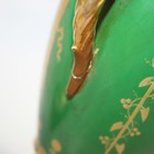 A pair of French porcelain vases, late 19th Century, each baluster body decorated in relief with classical figures and gilt decoration against a green ground, flanked by cornucopia handles, on square black bases, height approx 32.5cm (faults).