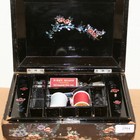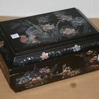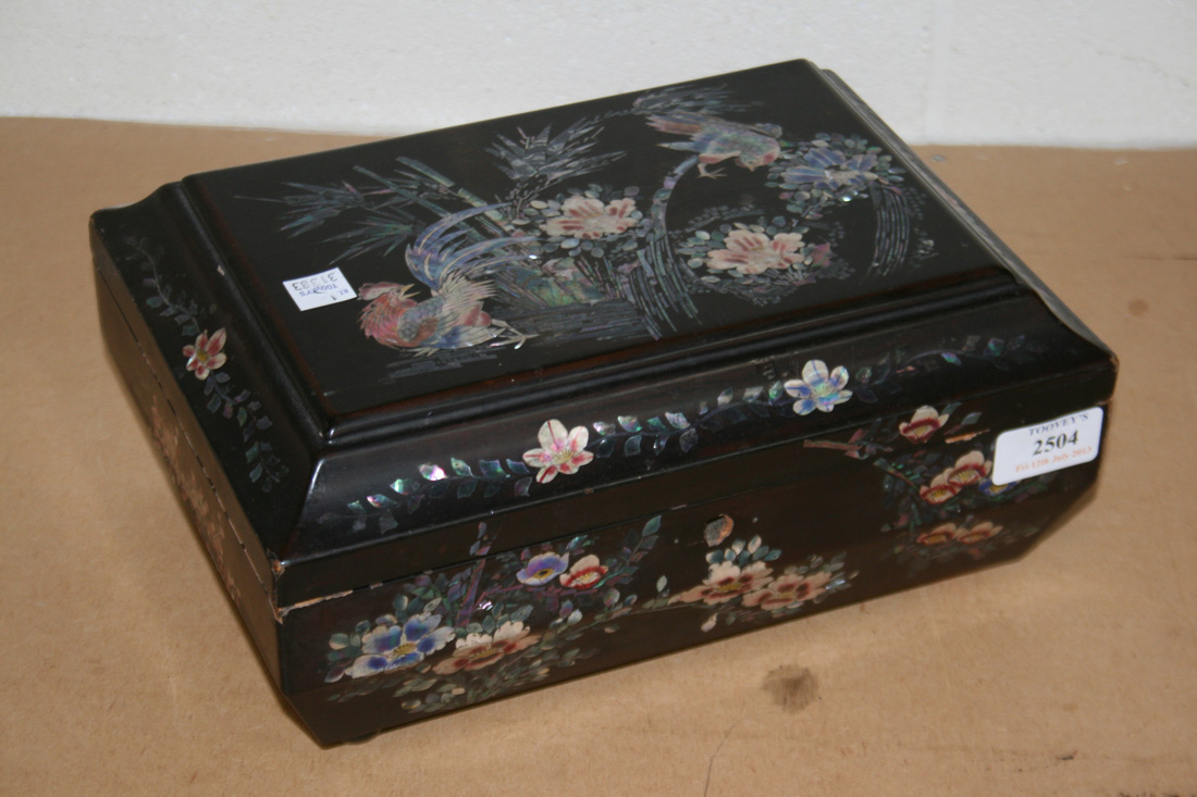 A late 19th/early 20th Century black lacquered and mother-of-pearl inlaid workbox of sarcophagus form, the interior fitted with a compartmentalized tray, length approx 28cm.