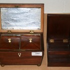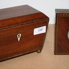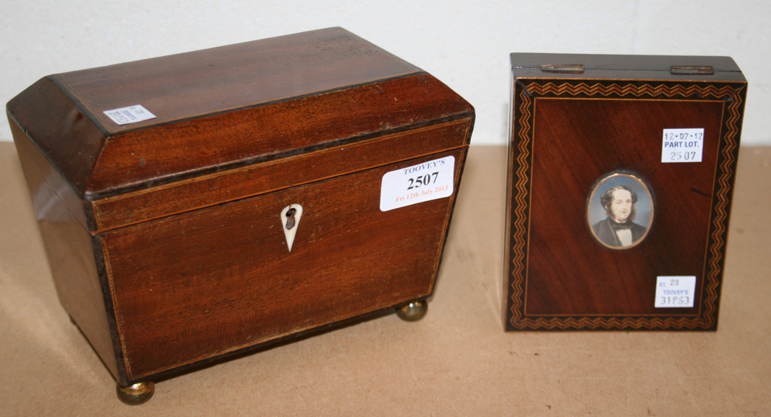 A 19th Century mahogany box, the lid inset with an oval printed miniature portrait, together with a 19th Century mahogany sarcophagus tea caddy.