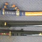 A modern reproduction of a samurai sword with blue woven handle and lacquered sheath, together with a lacquered stand and two similar reproduction swords.