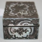 A 19th Century French mother-of-pearl cased nécessaire, of rectangular form, the exterior engraved and silvered with musical instrument vignettes within rococo scallop and scroll borders, the hinge lid with mirror interior, revealing two glass scent bottles, funnel and two lidded compartments, length approx 6cm.