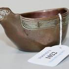 A Chinese bronze water dropper, probably late 19th/early 20th Century, of elliptical form with carved band and cast zoomorphic spout, incised four character mark to base, length approx 10.4cm.