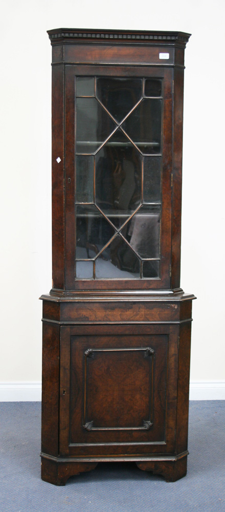 A 20th Century walnut corner cabinet, the dentil moulded pediment above an astragal glazed door and a panelled door, on bracket feet, width approx 67cm.