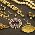 A Victorian gold and diamond set oval brooch, mounted with five rose cut diamonds, the back with a locket compartment fitted with a safety chain, a 15ct gold brooch with a floral spray motif at the centre, Chester 1905, an amethyst set single stone brooch, detailed '935', a pair of colourless paste set pendant earrings, and sundry mostly costume jewellery, including necklaces, imitation pearls, chains, two rings, and sundry.