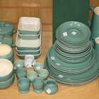A collection of green Denby dinner wares, including plates, bowls, jugs, teapot and cover, coffee pot and cover, dishes and egg cups.