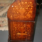 A late 18th Century Dutch marquetry roll-top bureau, decorated with overall inlaid panels of flower-charged urns, scrolling foliage and ribbon banding, the roll-top and slide-out writing surface revealing an interior of cascading drawers and a central cupboard flanked by leather bound faux book spines, one fitted as a secret compartment, the three breakfront drawers flanked by fluted and canted corners, on fluted tapering legs, height approx 118cm, width approx 127cm.