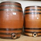 A pair of late 19th Century salt glazed stoneware flagons of barrel form by Doulton & Co, height approx 44cm.