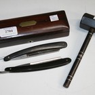 A 19th Century rosewood razor box, the hinged lid inset with a brass plaque, the interior fitted with two razors, together with an ebony gavel with wire inlaid decoration.