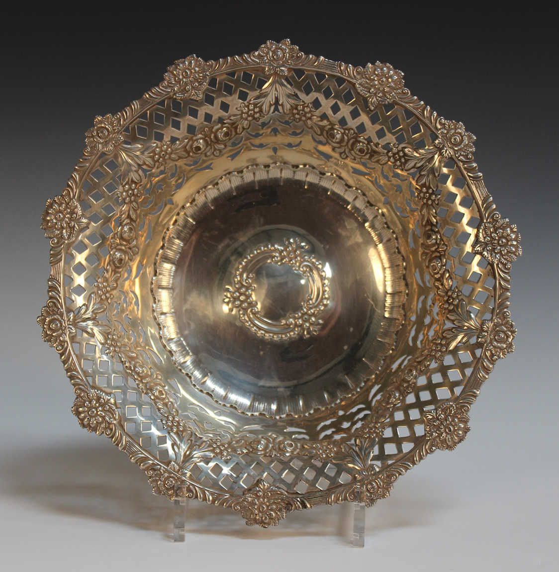 A late Victorian silver pierced circular basket, the rim cast with flowers, scrolls and gadrooning above pierced sides with embossed flower festoons on a circular foot, London 1896 by Edwin Charles Purdie, diameter approx 26.7cm.