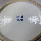 A pair of Chinese blue and white porcelain jars and covers, marks of Kangxi but late 19th Century, each baluster body painted with opposing panels filled with a pheasant and flowers, reserved against a lotus flowerhead and scrolling tendril ground, repeated on the domed cover, pseudo four character mark in underglaze blue to bases, height approx 41.5cm (chips to one cover and minor faults).