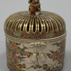 A Japanese Satsuma earthenware potpourri jar and cover, Meiji period, the pierced dome cover with shishi finial, the cylindrical body finely painted and gilt with riverside flowers and rushes, flanked by a pair of moulded tassel handles, on three short feet, brown painted signature to base, height approx 11cm (minor wear to gilt).