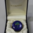 A Moorcroft enamel lid, decorated with a tree, against a blue ground, boxed.