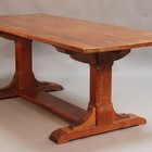 A mid-20th Century Heals oak dining room suite, comprising a rectangular refectory table on chamfered block supports, length approx 213cm, width approx 90cm, two carver chairs and four standard chairs with drop-in rush seats, on turned legs, and a sideboard, fitted with a central cellaret drawer, further cupboards and drawers, on turned and block legs, length approx 185cm, the chairs and sideboard bearing ivorine manufacturer's plaques.
