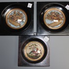 A pair of 19th Century miniature tondo three-dimensional floral pictures, each with a gilt metal basket of flowers, diameter approx 7.5cm, both within gilt metal and ebonized frames, together with a tondo feather picture of a bird.