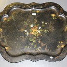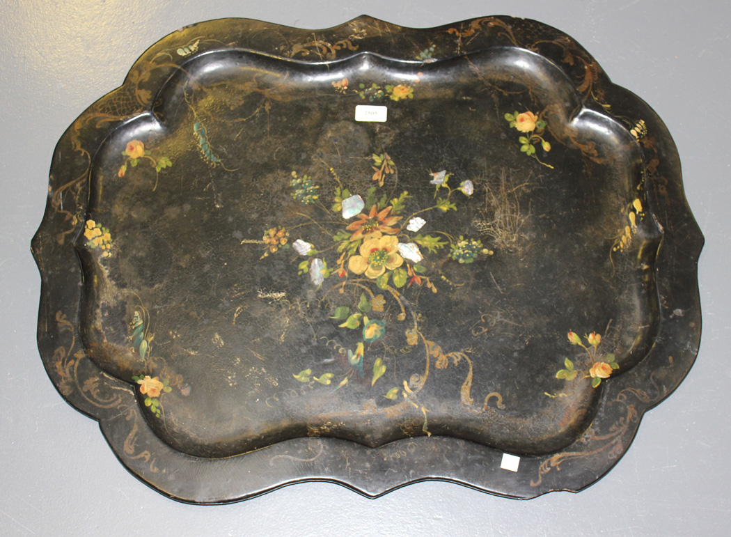 A Victorian papier-mâché tray of serpentine outline, painted and inlaid in mother-of-pearl, length approx 80cm.