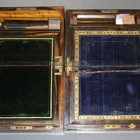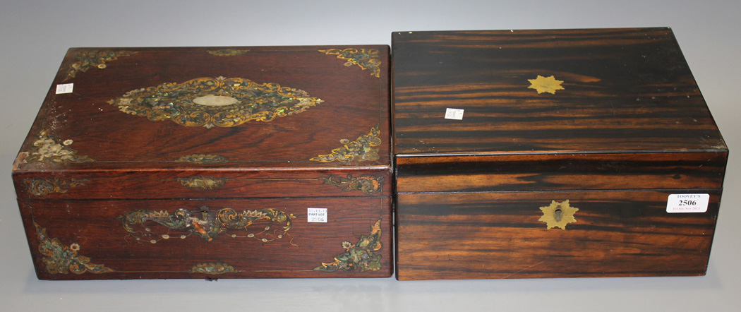 A Victorian coromandel writing slope, the hinged lid enclosing a fitted interior, together with a Victorian rosewood writing slope with mother-of-pearl and brass inlaid decoration (faults).