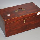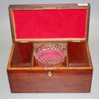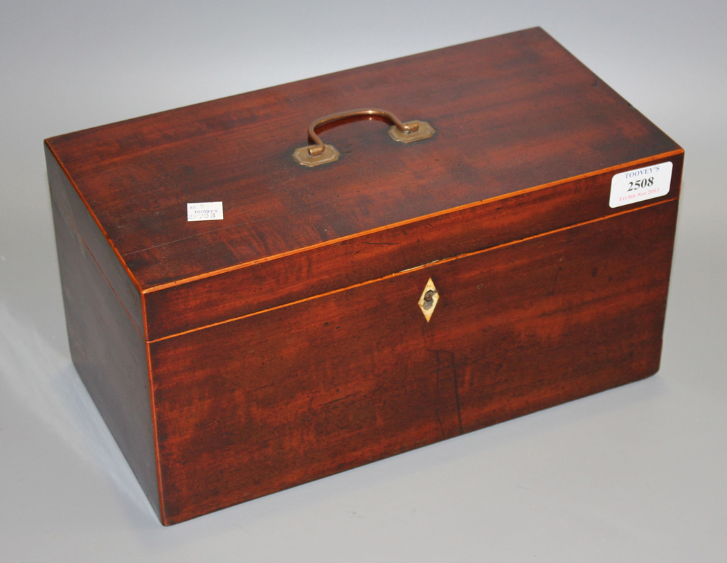 A George III mahogany rectangular tea caddy, the hinged lid revealing a pair of lidded canisters flanking a cut glass bowl, width approx 31cm.