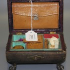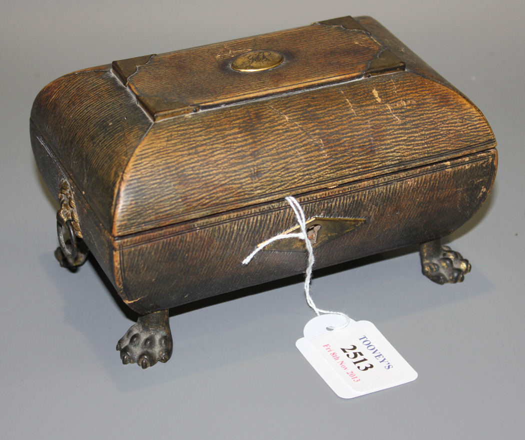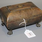 A Regency leather and gilt metal mounted needlework box of cushion form, the hinged lid revealing a fitted interior, on cast claw feet, width approx 15.5cm.