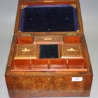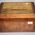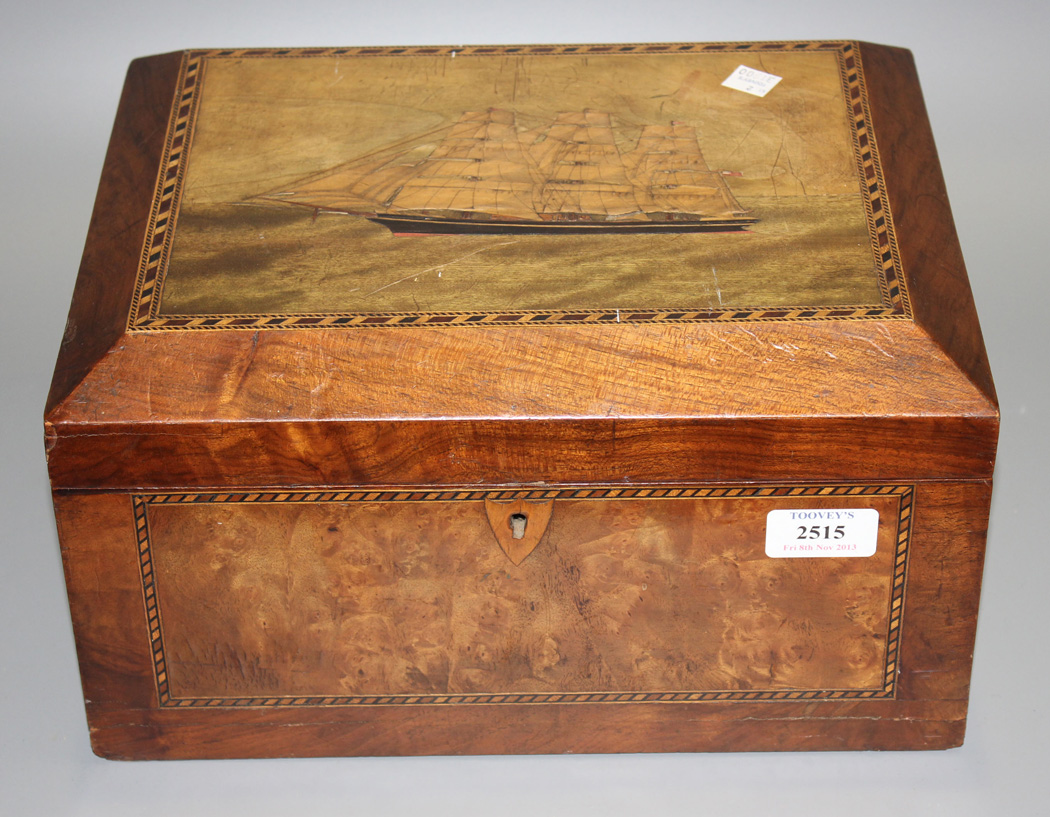 A late 19th/early 20th Century walnut workbox, the hinged lid inlaid with a three masted ship, the interior fitted with a removable tray, length approx 32cm.