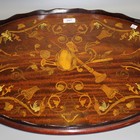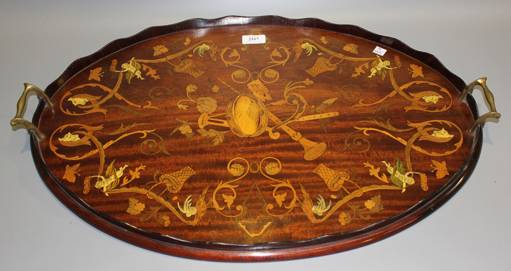 An Edwardian mahogany oval gallery tray with brass handles, the centre inlaid with musical instruments within a surround of cherubs, birds and scrolls, length approx 67.5cm.