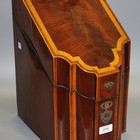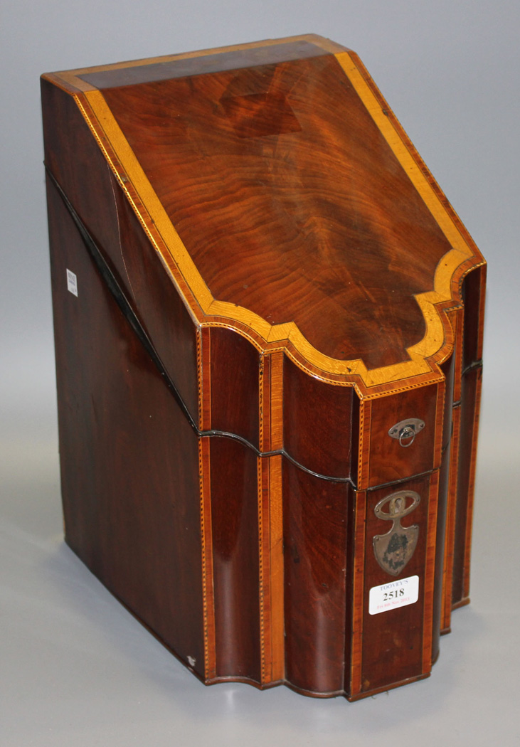 A George III figured mahogany knife box, the shaped front and hinged lid with crossbanded borders, with applied white metal key escutcheon and handle, the interior fitted with cutlery slots, width approx 22.5cm.