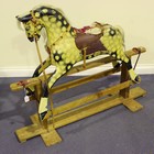 A mid-20th Century dapple grey rocking horse, possibly Collinson & Sons, with painted features, mane, tail and parts of the saddle, the wooden base with square tapering supports, overall length approx 127cm (faults).