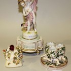 A Sitzendorf porcelain triple egg cup, late 19th Century, each flower encrusted egg cup supported by a recumbent putto on a circular base, together with a Continental porcelain figure of a putto and a Staffordshire bone china spill vase modelled with two birds and a nest (minor faults).