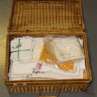 A collection of textiles, including embroidered Indo-Persian panels, tablecloths and napkins.