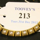 A gold and half pearl set bracelet in a curb chain link design, the front mounted with a row of eleven half pearls within square shaped settings, the snap clasp detailed '15ct', total length approx 19.5cm.