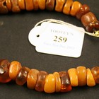 A single row necklace of sixty-two vari-coloured yellow and brown mottled and semi-translucent graduated disc shaped amber beads, gross weight approx 118g, total length approx 54cm.