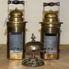 A pair of early 20th Century French brass miners' lamps and a brass desk bell.
