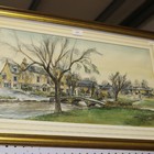 Attributed to Sandra Francis - View of Bourton-on-the-Water, Cotswolds, late 20th Century watercolour, artist's name to label verso, approx 32cm x 57cm, within a gilt frame.