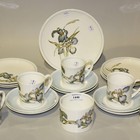 A Wedgwood Susie Cooper 'Iris' pattern part coffee service, comprising a cake plate, six plates, cans and saucers, cream jug and sugar bowl.