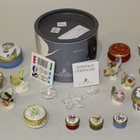 A Royal Worcester 'The Connoisseur Collection' pill box, a small group of other pill boxes and three items of Swarovski crystal, comprising oyster, starfish and shell, boxed, together with five Goebel Hummel models of two birds, bumblebee, butterfly and pig.