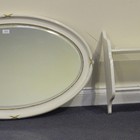 An Edwardian white painted oval wall mirror with a ribbon moulded frame, approx 60cm x 94cm, together with a two-tier wall shelf.