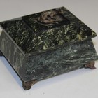 An early 20th Century green marble box and cover of sarcophagus form, applied with bronze lizard handle and leaf scroll feet, width approx 11cm.