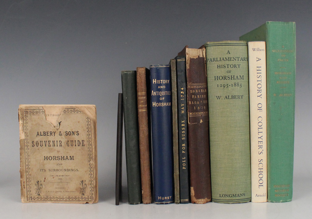 SUSSEX, HORSHAM. - W. ALBERY. Albery & Son's Souvenir Guide to Horsham and its Surroundings. Horsham: C.H. Nutt, 1880. 12mo (137 x 110mm.) Numerous advertisements. (Some browning and spotting.) Original wrappers (torn with loss, backstrip lacking, staples lacking thus now disbound). - And ten others mostly relating to Horsham, West Sussex (11).