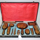 A South-east Asian tortoiseshell dressing table set, 20th Century, each piece incised and gilt with dragons, comprising hand mirror, hairbrush, two clothes brushes, comb, pin tray, oval soap box and cover, circular box and cover, shoehorn, nail buffer, button hook and nail file, within a fitted case.