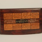 A Victorian rosewood and inlaid specimen snuff box, of rectangular concave form, the hinge lid and base inlaid with twenty two various wood specimens, each with inscription, including 'Oak of Holyrood Palace', 'Oak of the House of Commons, burnt 16th Oct. 1834', 'Tiel Wood From Columbus House Madeira', 'Oak of Lord Nelson's Flagship Victory', 'Oak from Glasgow Cathedral', and 'Oak from the ship which brought over King William III in 1688', length approx 10cm.