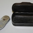 An early 20th Century aluminium novelty vesta case in the form of an old shoe, with hinged match strike heel, length approx 7.5cm, together with a papier-mâché snuff box, the hinged lid with faux tortoiseshell panel top, length approx 9.5cm.