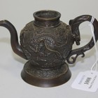 A Chinese brown patinated bronze diminutive teapot, probably late 19th Century, the body cast in relief with two dragons amidst vapours, flanked by a dragon handle, on a circular foot, cast signature to base, height approx 8.5cm (lacking cover).