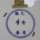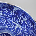 A Chinese blue and white porcelain saucer dish, mark of Kangxi and of the period, painted to the interior and exterior with dragons amongst vapours, six character mark within a double ring in underglaze blue to base, diameter approx 32cm (rivet repaired and chipped).