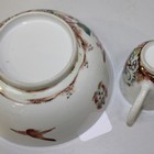 A Chinese armorial export porcelain bowl and matching coffee cup, Qianlong period, each painted with a red, grey and gilt crest, otherwise painted with a bird perched on rocks, bird in flight and pink blossoming branches, bowl diameter approx 14cm (faults).