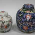 A Chinese famille rose porcelain ginger jar and cover, late 19th/early 20th Century, painted with opposing figural panels within borders of flowers, bats and fruit, height approx 14cm, together with a Chinese blue ground porcelain ginger jar and cover, mark of Kangxi but late 19th/early 20th Century, painted with two dragons, lotus flowers and scrolling tendrils, height approx 19.5cm.
