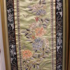 A pair of Chinese silk embroidered rectangular panels, early 20th Century, each worked in polychrome and gilt thread with flowers and insects on a pale green ground within a black border filled with prunus, bamboo and precious objects, approx 64cm x 30.5cm, framed and glazed.
