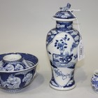 A Chinese blue and white porcelain vase and cover, late 19th Century, the baluster body painted with opposing panels filled with precious objects and vessels, against a dragon and vapour ground, pseudo four character mark to base, height approx 21cm, together with a Japanese blue and white bowl and cover painted with elephants and figures and a small blue and white vase.