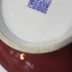 A Chinese copper red porcelain bottle vase, Qing dynasty, of low-bodied form, covered in a pinkish liver red glaze with 'orange-peel' texture, underglaze blue six character seal mark of Qianlong to base, height approx 22.5cm (hairlines to foot), with carved and pierced wood stand.