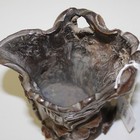 A Chinese carved rootwood brushpot, late Qing dynasty, the gnarled trunk carved in low relief with a pair of chequer players, another figure and various auspicious animals, including 3-legged toads, hare, owl, bat and rat, beneath tree branches, carved inscription to base including indistinct date, possibly 1877, height approx 12.5cm.