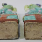 A pair of Chinese famille rose porcelain Buddhistic lion jostick holders, Qianlong period, each modelled seated on a cube base, height approx 23cm (some faults).